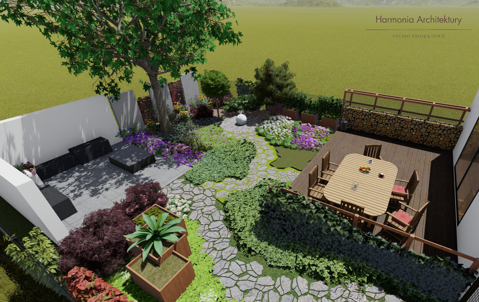 Ogród frontowy i ogród głównyLokalizacja: Poznań, StrzeszynPowierzchnia: 330 m2Zakres prac: Projekt ogrodu bez trawnika, przy zastosowaniu roślin okrywowych i mało wymagających. Harmonijny ogród zaprojektowany wg zasad feng-shui.